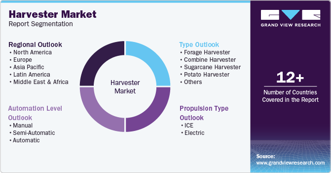 This report forecasts revenue growth at global, regional, and country levels and provides an analysis of the latest industry trends in each of the sub-segments from 2017 to 2030. For this study, Grand View Research has segmented the global harvester market report based on type, automation level, propulsion type, and region: