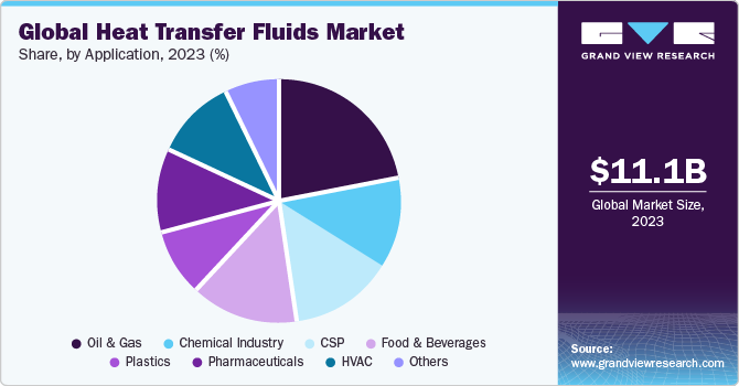 The global heat transfer fluids market size was estimated at USD 11.1 billion in 2023 and is projected to reach USD 14.22 billion by 2030, growing at a CAGR of 3.7% from 2024 to 2030. The rapid adoption of concentrated solar power globally is one of the major factors driving demand. Heat transfer fluids are industrial products derived from petroleum sources that prevent overheating and store thermal energy.