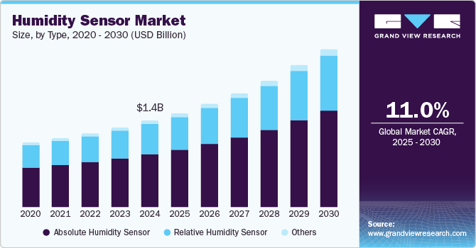 The global humidity sensor market size was valued at USD 1.38 billion in 2024 and is projected to reach USD 2.54 billion by 2030, growing at a CAGR of 11.0% from 2025 to 2030. Humidity sensors can sense the levels of moisture present in the air in real-time with high accuracy.