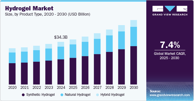 The global hydrogel market size was estimated at USD 34,250.8 million in 2024 and is projected to reach USD 51,821.2 million by 2030, growing at a CAGR of 7.4% from 2025 to 2030. The rising demand for wound care products is one of the primary drivers of the global market.
