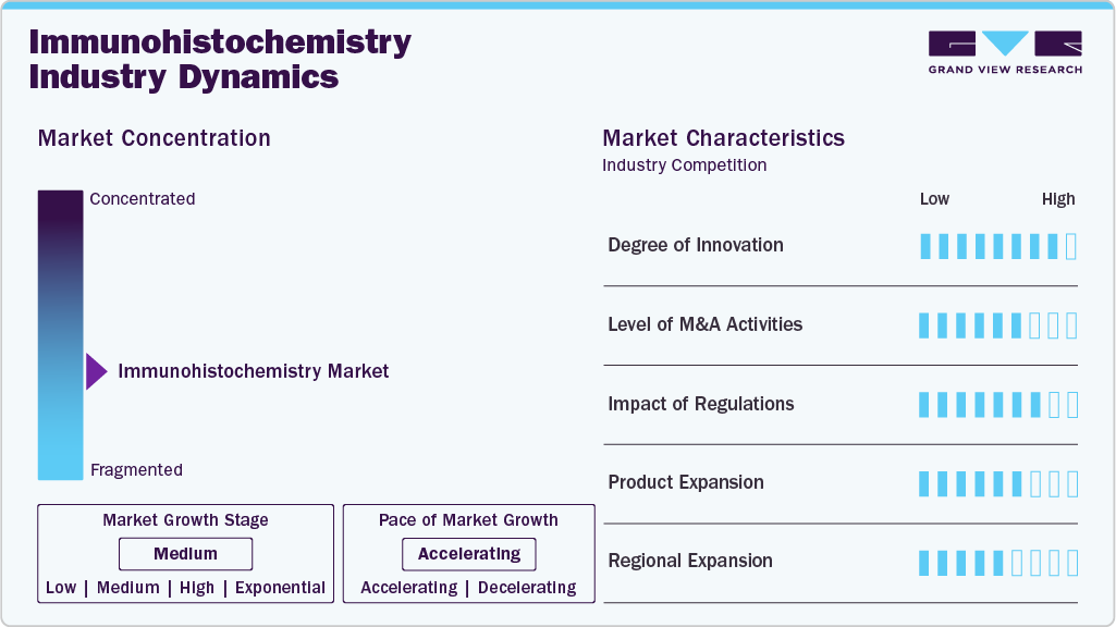 Regulation plays a significant role in shaping the IHC market. Regulatory approvals, particularly in the U.S. and Europe, are essential for clinical-grade IHC products. Compliance with standards such as CE-IVD, FDA 510(k), and CLIA is crucial for product commercialization. The impact is especially high in companion diagnostics, where IHC assays are co-developed with targeted therapies and require close coordination with drug regulatory bodies. Additionally, evolving regulatory frameworks around digital pathology and AI use in diagnostics are beginning to influence product development strategies.