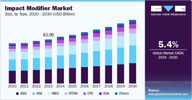 The global impact modifier market size was valued at USD 3.86 billion in 2023 and is expected to reach USD 5.53 billion by 2030, growing at a CAGR of 5.4% from 2024 to 2030. This growth is driven by increasing demand for lightweight and durable materials in various industries, particularly automotive and construction.