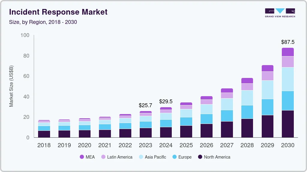 b. The global incident response market is expected to grow at a compound annual growth rate of 19.9% from 2024 to 2030, reaching USD 87.53 billion by 2030.