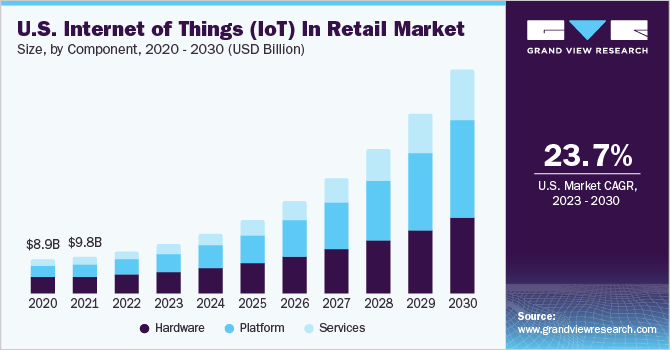 b. The global Internet of things in retail market is expected to grow at a compound annual growth rate of 28.4% from 2023 to 2030 to reach USD 297.44 billion by 2030.