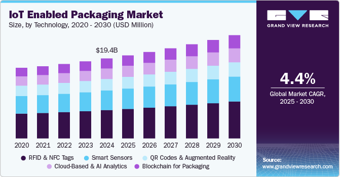 The global IoT enabled packaging market was estimated at USD 19.37 billion in 2024 and is expected to expand at a CAGR of 4.4% from 2025 to 2030. The market is witnessing significant growth driven by the growing demand for smarter, more efficient supply chains. IoT-enabled packaging provides real-time data on the condition, location, and status of products during transport and storage, which allows businesses to optimize logistics, reduce losses, and improve efficiency.
