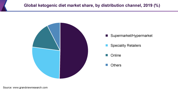 The supermarket/hypermarket segment held the largest share of more than 50.0% in 2019 and is anticipated to maintain its lead over the forecast period. Major manufacturers are promoting their products through offline retail stores, such as hypermarkets and supermarkets. Moreover, several companies are opening new brick and mortar stores worldwide to expand their customer base. For instance, Target Brands, Inc. announced its plans to inaugurate around 25 new stores in the U.S. by the end of 2020. In addition, the company is planning to add seven more stores in the U.S. by 2021. The increasing number of offline stores expands the scope of this distribution channel in the ketogenic diet industry.