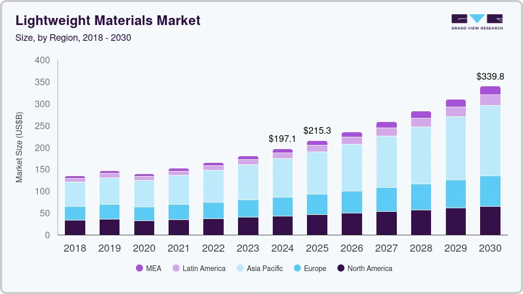 The global lightweight materials market size was estimated at 197.1 billion in 2024 and is projected to reach USD 339.8 billion by 2030, growing at a CAGR of 9.6% from 2025 to 2030. This growth is driven by multiple factors, including the increasing emphasis on fuel efficiency in transportation, the rise of eco-friendly construction practices, and innovations in material science.