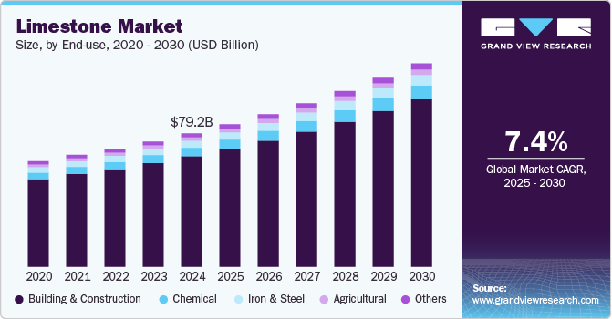 The global limestone market size was estimated at USD 79.18 billion in 2024 and is projected to reach USD 120.70 billion by 2030, growing at a CAGR of 7.4% from 2025 to 2030. Growing investments in water treatment and purification activities are projected to provide push to the demand of limestone in coming years.