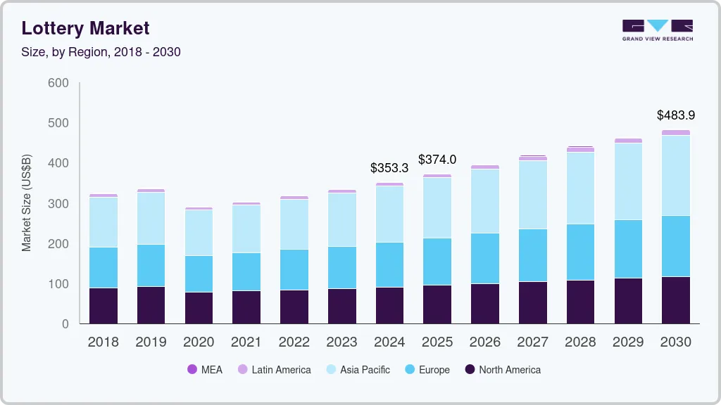 b. The global lottery market size was estimated at USD 353.29 billion in 2024 and is expected to reach USD 374.01 billion in 2025.