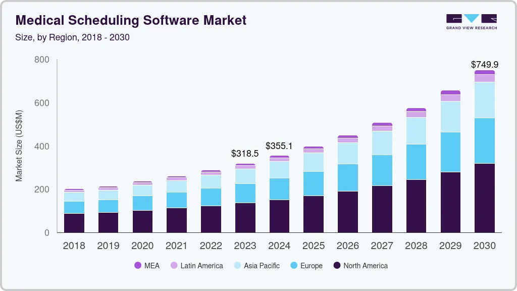 b. The global medical scheduling software market size was estimated at USD 318.47 million in 2023 and is expected to reach USD 355.09 million in 2024.