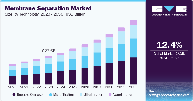 The global membrane separation market size was valued at USD 27.6 billion in 2023 and is projected to grow at a CAGR of 12.4% from 2024 to 2030. Key drivers propelling market expansion include the escalating demand for clean water, stringent wastewater discharge regulations, rapid industrialization in emerging economies, growth within the food and beverage sector, and the global challenge of water scarcity.