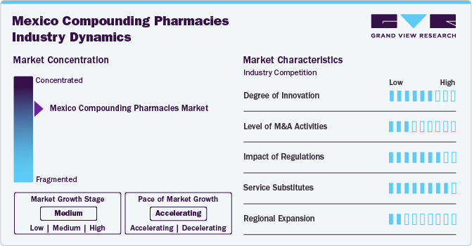 The chart below illustrates the relationship between market concentration, market characteristics, and market participants. The x-axis represents the level of market concentration, ranging from low to high. The y-axis represents various market characteristics, including degree of innovation, industry competition, service substitutes, and impact of regulations, level of partnerships & collaborations activities, and geographic expansion. For instance, the Mexico compounding pharmacies industry is fragmented, with many small players entering the market and launching new innovative services. The degree of innovation is medium, the level of merger & acquisition activities is low, the impact of regulations on the market is high, and the regional expansion of the market is low.
