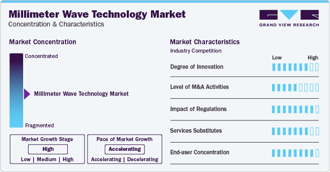 The market growth stage is high, and the pace of the market growth is accelerating. The market can be characterized by a high degree of innovation that is driven by the growing demand for faster data speeds and the need for higher connectivity from various industries. Innovations in antenna designs and signal processing, among others, are improving the overall mmWave technology.