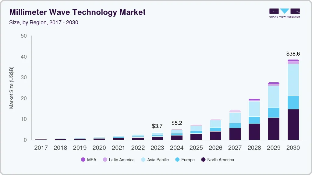 The global millimeter wave technology market size was estimated at USD 3.75 billion in 2023 and is projected to reach USD 38.55 billion by 2030, growing at a CAGR of 39.7% from 2024 to 2030. Millimeter wave (mmWave) is the band spectrum with wavelengths between 30 GHz to 300 GHz.