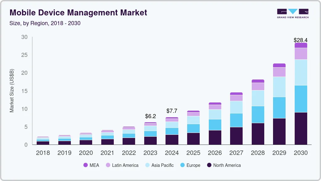b. The global mobile device management market is expected to grow at a compound annual growth rate of 24.5% from 2025 to 2030 to reach USD 28.37 billion by 2030.