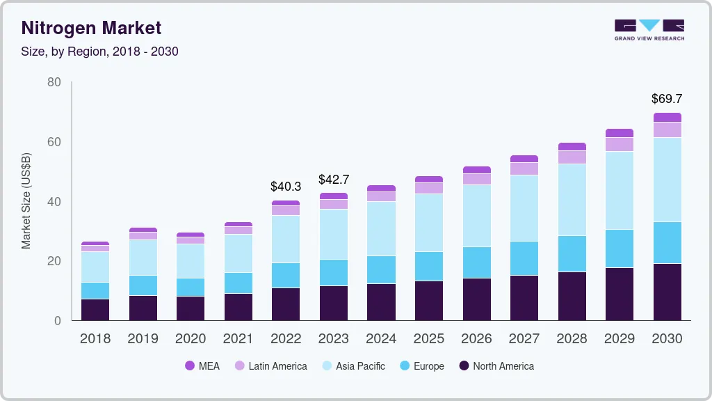 The global nitrogen market size was estimated at USD 30.4 billion in 2023 and is projected to reach USD 44.28 billion by 2030, growing at a CAGR of 6.4% from 2024 to 2030. This is attributable to ongoing urbanization and industrialization and the increasing application of nitrogen in various industries such as healthcare, manufacturing, metals and mining, and food & beverages.