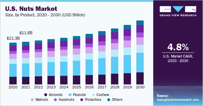 b. The global nuts market is expected to grow at a compound annual growth rate of 5.4% from 2023 to 2030 to reach USD 85.15 billion by 2030.