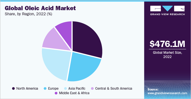 b. North America dominated the oleic acid market with a share of 28.4% in 2022. This is attributable to increasing demand from personal care & cosmetics industry especially from developed countries like the U.S. Moreover, increasing usage of oleic acid as a flavoring agent in multiple food products is boosting the market in North America region.