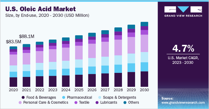 b. The global oleic acid market is expected to grow at a compound annual growth rate of 4.6% from 2023 to 2030 to reach USD 684.7 million by 2030.