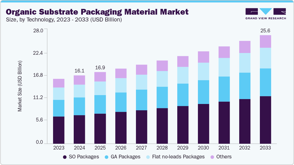 Organic Substrate Packaging Material Market (2025 - 2033) Size, Share & Trends Analysis Report By Technology (SO packages, GA packages, Flat no-leads packages), By Application, By Region, And Segment Forecasts