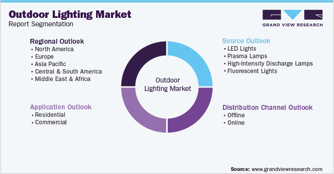 This report forecasts revenue growth at global, regional & country levels and provides an analysis of the latest trends and opportunities in each of the sub-segments from 2018 to 2030. For the purpose of this study, Grand View Research has segmented the outdoor lighting market on the basis of source, application, distribution channel, and region.