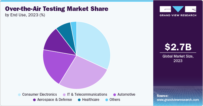 In terms of end use, the market is classified into consumer electronics, automotive, IT & telecommunications, aerospace and defense, healthcare, and others. The consumer electronics segment dominated the market in 2023 and accounted for more than 31.0% share of global revenue. The growing proliferation of smartphones, tablets, and other connected consumer electronic devices drives the segment’s growth. The proliferation of smartphones, tablets, and other connected devices requires comprehensive OTA testing to ensure they function seamlessly across cellular networks. Moreover, intense competition among consumer electronics manufacturers drives the need for comprehensive testing to differentiate products and maintain a competitive edge.