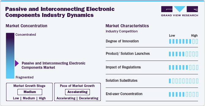 The passive and interconnecting electronic components market growth stage is medium, and the pace of growth is accelerating. The market is fragmented, with the presence of numerous passive and interconnecting electronic component manufacturers. The target market is characterized by a high degree of innovation, with market players introducing smaller passive electronic components. This has led to advancements in materials and manufacturing techniques to ensure the development of smaller components without compromising performance.