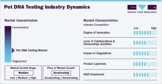 The pet DNA testing industry is generally consolidated. The market is at a medium-growth stage, and the expansion rate is expanding. Rapid advances in veterinary diagnostics and increased R&D expenditure by the key players are key drivers of market growth. The rate of technical advancement influences market concentration. Companies investing in R&D to introduce novel products with improved features and efficacy could gain a competitive advantage and expand their market shares. In contrast, companies that fail to keep up with technological advances risk losing market share to competitors.