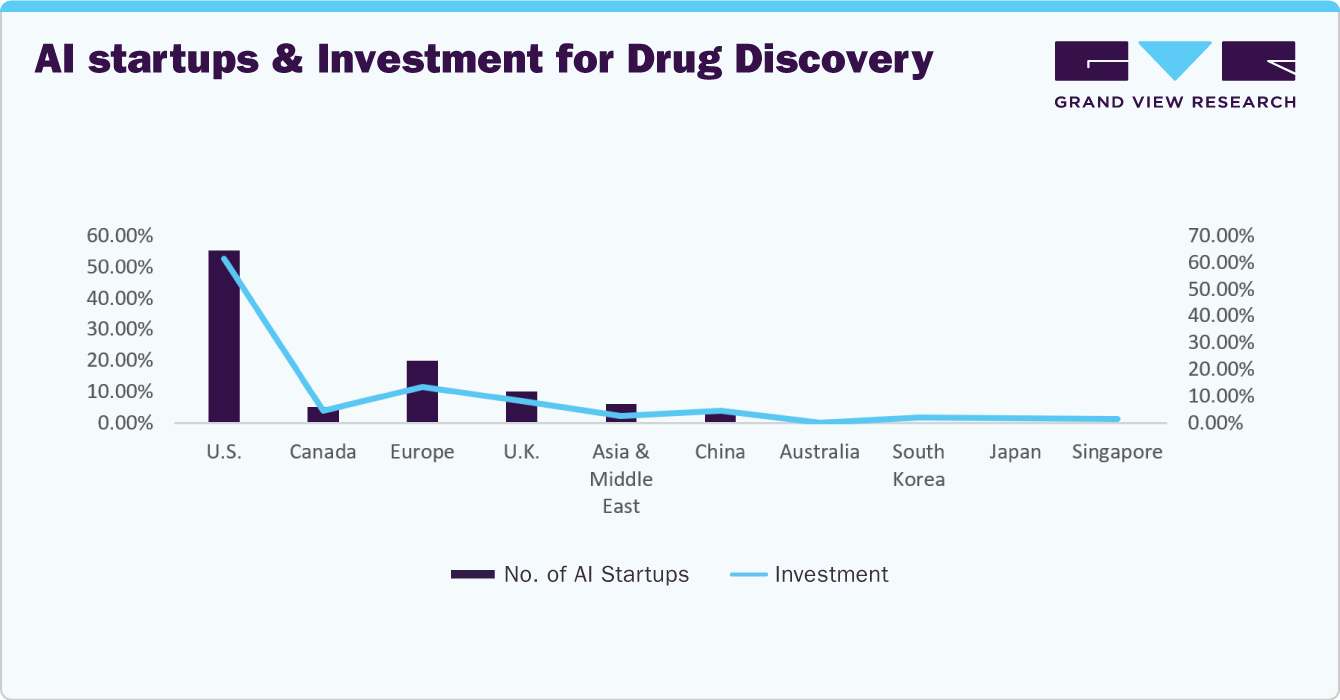 U.S. is the leading country in the AI adoption within the pharmaceutical industry.Availability of developed infrastructure to facilitate the adoption of AI, coupled with the local presence of major players operating, is expected to contribute to market growth. In addition, growing awareness about AI and increasing number of manufacturers adopting it to lower costs of drug discovery is expected to further support market growth in the U.S.