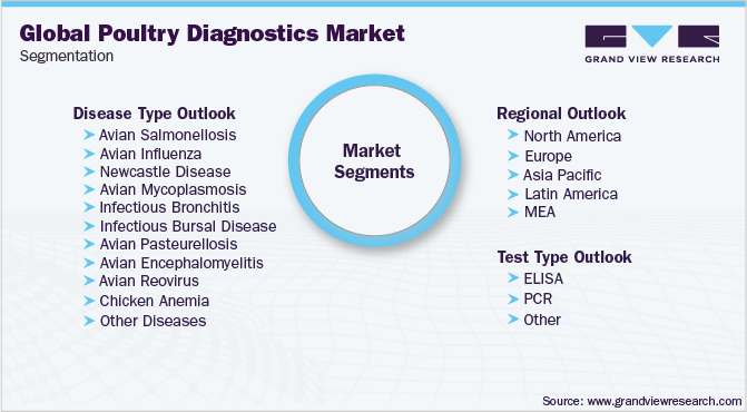 This report forecasts revenue growth at global, regional, and country levels and provides an analysis of the latest industry trends in each of the sub-segments from 2018 to 2030. For this study, Grand View Research has segmented the global poultry diagnostics market report based on test, disease, test category, product, end use, and region