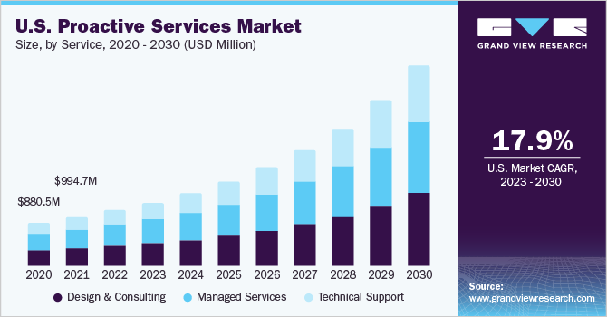 b. The global proactive services market is expected to grow at a compound annual growth rate of 20.8% from 2023 to 2030 to reach USD 18.19 billion by 2030.