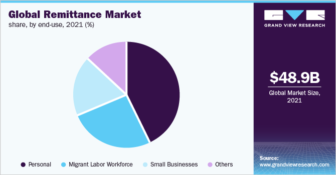 The personal segment accounted for the largest global revenue share of more than 42.0% in 2021. Personal remittances refer to all financial transactions between resident and non-resident parties, and the residents can be non-migrants or migrants. According to Eurostat, Directorate-General of the European Commission, Romania, Latvia, and Croatia were most dependent on inflows of personal remittances in the EU in 2020, representing the significance of personal remittances. Moreover, there are internal remittances transfers within the borders of a country as well, contributing to the segment's dominance.