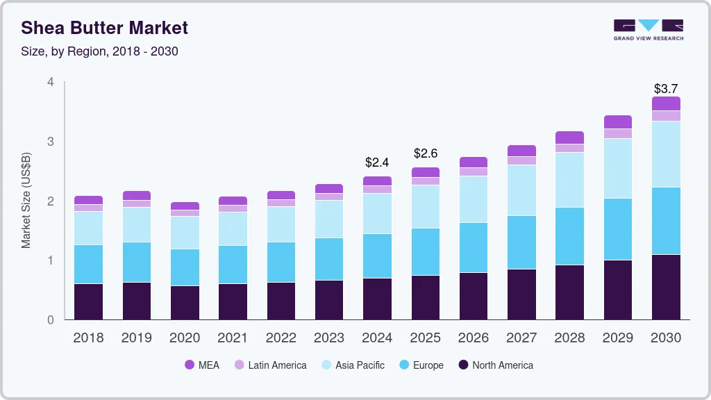 b. The global shea butter market size was estimated at USD 2,412.4 million in 2024 and is expected to reach USD 2,562.1 million in 2025.