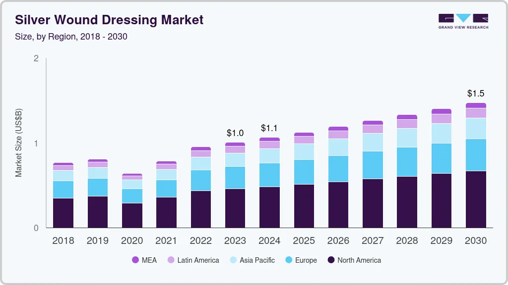 b. The global silver wound dressing market size was estimated at USD 1.03 billion in 2024 and is expected to reach USD 1.08 billion in 2025.