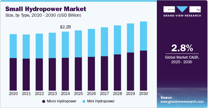 The global small hydropower market size was valued at USD 2.18 billion in 2024 and is projected to reach USD 2.56 billion by 2030, growing at a CAGR of 2.8% from 2025 to 2030. The industry is primarily driven by the increasing global demand for renewable energy and rural electrification initiatives.