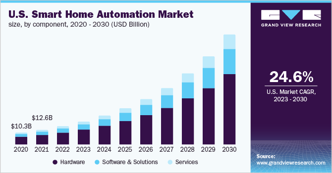 b. The global smart home automation market is expected to grow at a compound annual growth rate of 27.3% from 2023 to 2030 to reach USD 444.98 billion by 2030.
