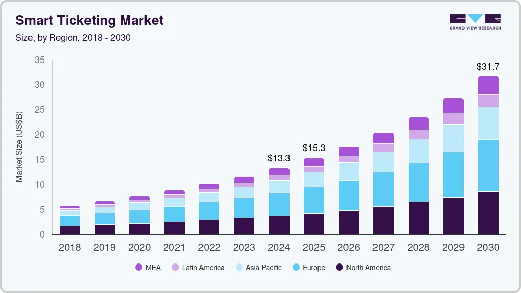 b. The global smart ticketing market is expected to grow at a compound annual growth rate of 15.7% from 2025 to 2030 to reach USD 31.65 billion by 2030.