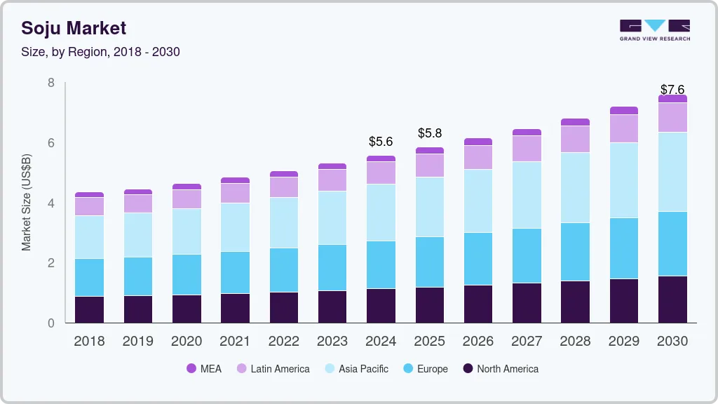 The global soju market size was estimated at USD 5.57 billion in 2024 and is projected to reach USD 7.59 billion by 2030, growing at a CAGR of 5.4% from 2025 to 2030. Several interconnected factors influence the rising demand and consumption of soju.