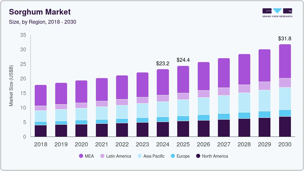The global sorghum market size was estimated at USD 23.19 billion in 2024 and is projected to reach USD 31.77 billion by 2030, growing at a CAGR of 5.5% from 2025 to 2030. The market is growing due to its versatile applications, including being a staple food in regions such as Africa and Asia, a valuable nutritional component in livestock feed, and a source for biofuel production.