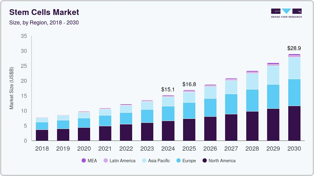 b. The global stem cells market is expected to grow at a compound annual growth rate of 11.41% from 2025 to 2030 to reach USD 28.89 billion by 2030.