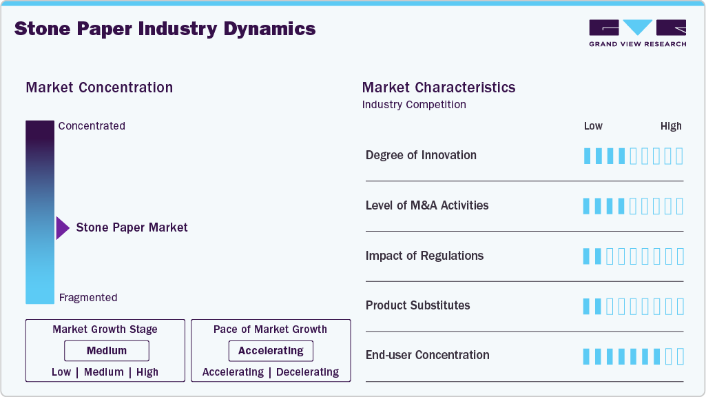The stone paper industry is characterized by a medium degree of innovation. Key industry participants are focusing on introduction of advanced, durable, tear-resistance, and waterproof solutions to conventional papers. For instance, TBM Co., Ltd. under its LIMEX brand produces high-performance masterbatch (HPM) and plastics products made from stone paper used to produce various stationery products and bag carriers.
