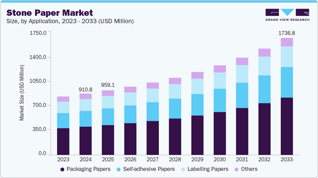 The global stone paper market size was estimated at USD 959.1 million in 2025 and is projected to reach USD 1,736.8 million by 2033, growing at a CAGR of 8.0% from 2026 to 2033. Product demand is expected to witness significant growth over the projected period on account of ecofriendly, recyclable, and waterproof qualities of stone paper.