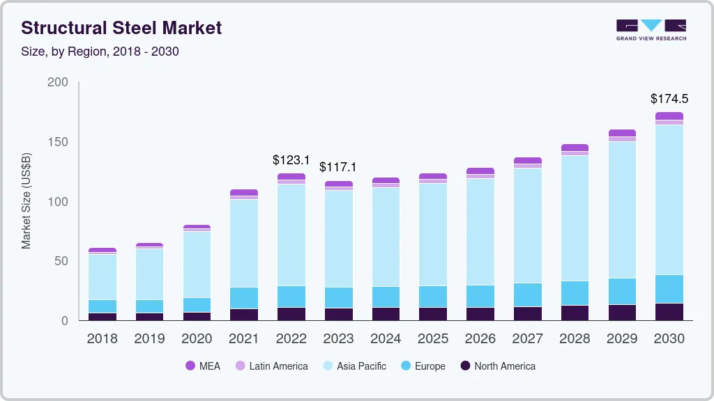 The global structural steel market size was estimated at USD 110.74 billion in 2023 and is projected to reach USD 174.51 billion by 2030, growing at a CAGR of 4.5% from 2024 to 2030. Infrastructural developments, in both developing as well as developed countries, are anticipated to remain the primary factors driving the demand for structural steel.