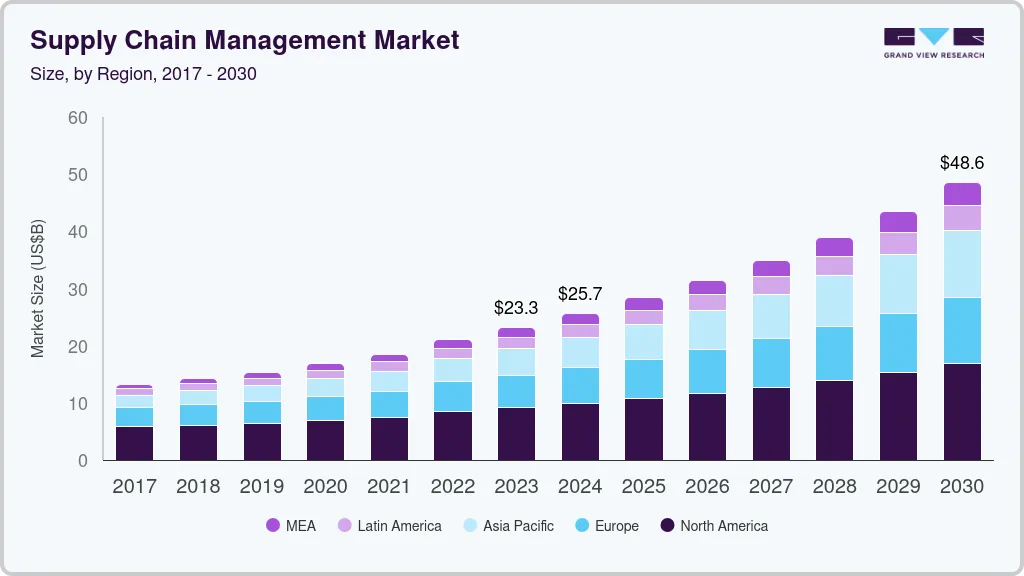 b. The global supply chain management market size was estimated at USD 25.67 billion in 2024 and is expected to reach USD 48.59 billion in 2030.