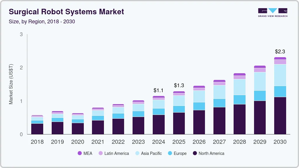 b. The global surgical robot systems market is expected to grow at a compound annual growth rate of 12.4% from 2025 to 2030 to reach USD 23.13 billion by 2030.