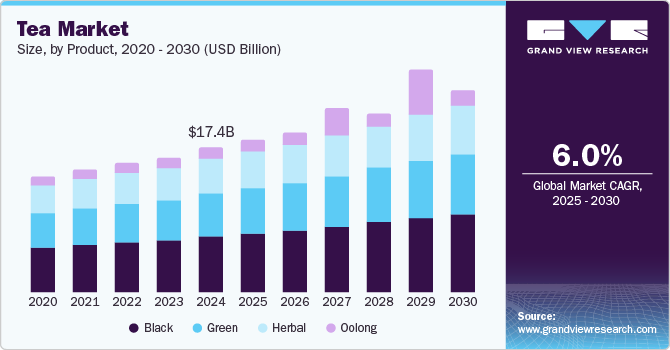 The global tea market size was valued at USD 17.42 billion in 2024 and is projected to reach USD 24.61 billion by 2030, growing at a CAGR of 6.0% from 2025 to 2030. The market growth is attributed to the rising health consciousness among consumers, who are increasingly aware of the health benefits of tea, including its ability to reduce inflammation and promote relaxation.