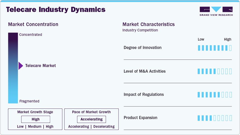The telecare industry is characterized by a moderate level of merger and acquisition (M&A) activities by leading players. Major players in the telecare industry have acquired smaller companies to gain access to new technologies, talent, and customer bases. For instance, in April 2024, OMRON Healthcare, Co., Ltd. acquired Luscii Healthtech, a digital health and remote consultation service platform. With this acquisition, Luscii is developing a comprehensive service that cohesively aids healthcare professionals, from general practitioners to hospitals, all within one unified platform.