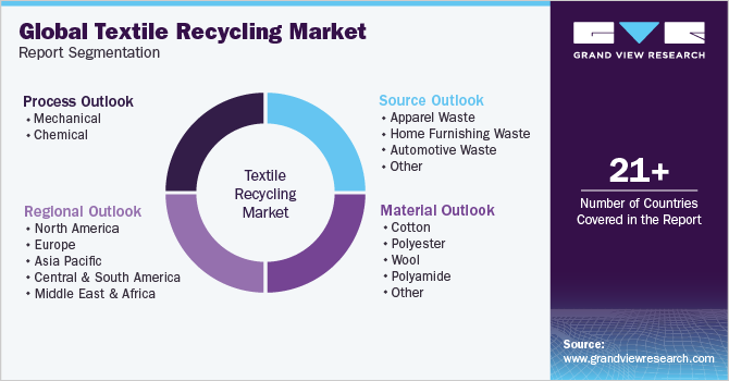 This report forecasts revenue growth at global, regional, and country levels and provides an analysis of the latest industry trends in each of the sub-segments from 2021 to 2033. For this study, Grand View Research has segmented the global textile recycling market report based on material, process, source, and region.
