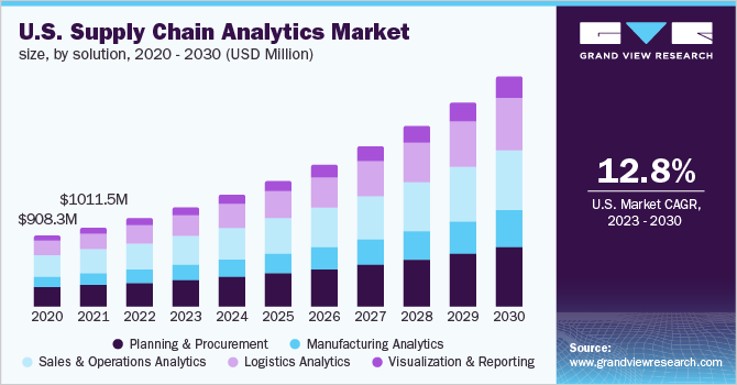 b. The global supply chain analytics market is expected to grow at a compound annual growth rate of 17.8% from 2023 to 2030 to reach USD 22.46 billion by 2030.