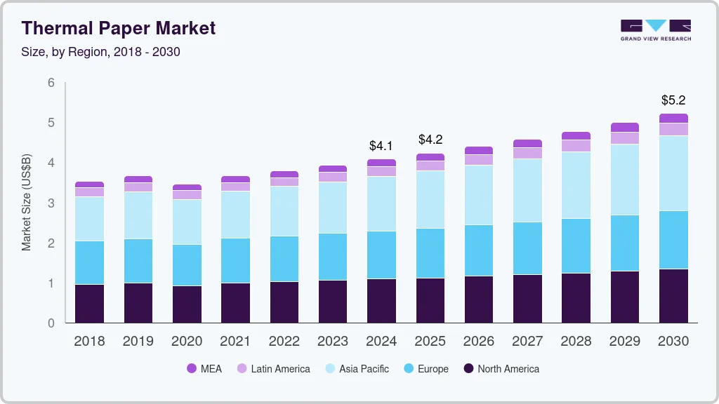 b. The global thermal paper market is expected to grow at a compound annual growth rate of 4.2% from 2025 to 2030 to reach USD 5.22 billion by 2030.